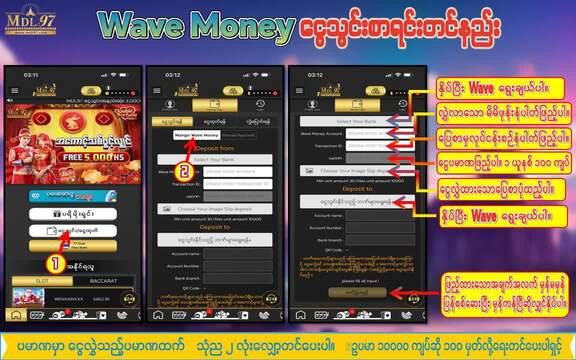 သင့်၏ငွေသွင်းငွေပမာဏ (၅,၀၀၀ ကျပ်အနည်းဆုံး) ကိုရွေးချယ်ပြီး၊ သက်ဆိုင်ရာ ငွေလွှဲနည်းလမ်း (Mobile Banking, WavePay, KBZ Pay စသည်) ကိုရွေးချယ်ပါ။ - ငွေလွှဲလိပ်စာသို့ ငွေလွှဲခြင်း